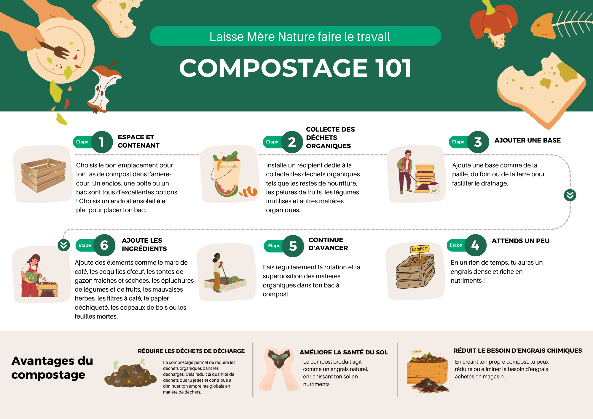 Le compostage est la manière dont Dame Nature s’occupe de ses ordures. Les feuilles tombées, les fruits, et les branches d’arbres mortes se décomposent tous naturellement, produisant un sol riche appelé humus qui nourrit les plantes.